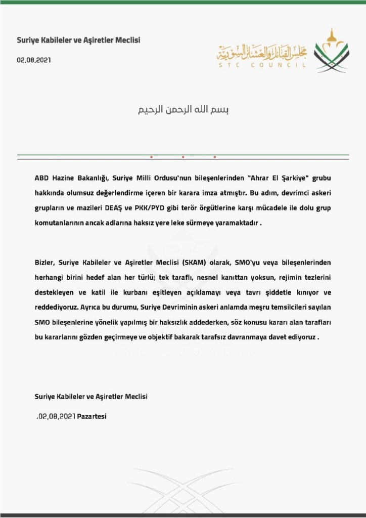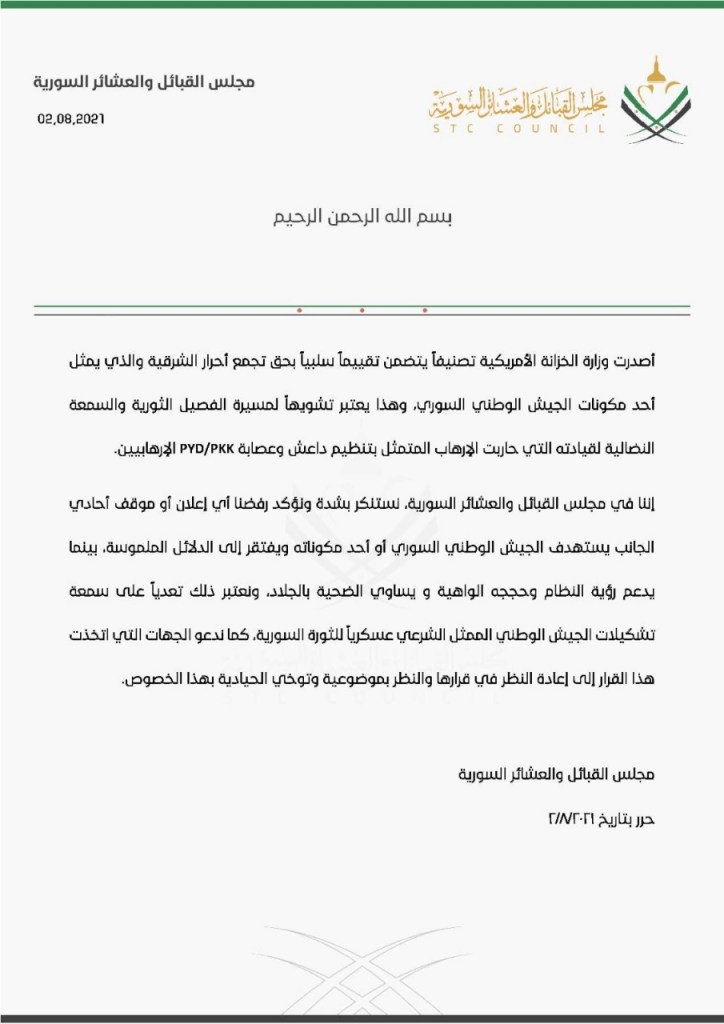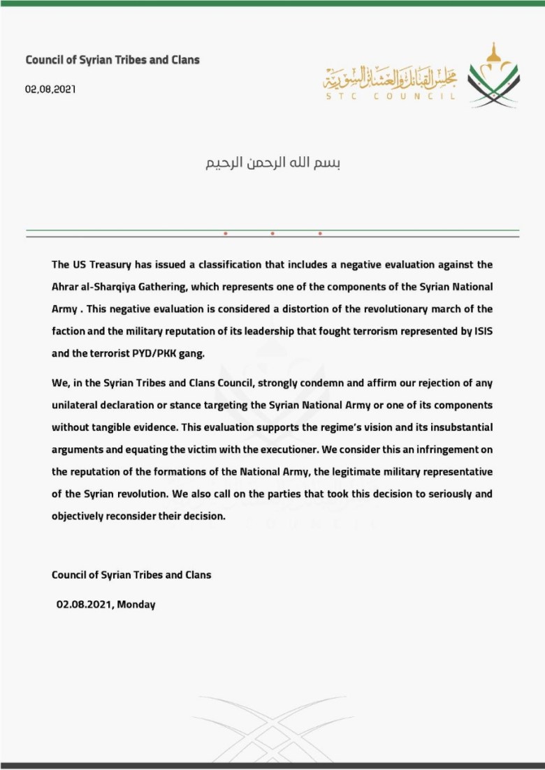 إننا في مجلس القبائل والعشائر السورية، نستنكر بشدة ونؤكد رفضنا أي اعلان أو موقف أحادي الجانب يستهدف الجيش الوطني السوري أو أحد مكوناته ويفتقر إلى الدلائل الملموسة، بينما يدعم رؤية النظام وحججه الواهية و يساوي الضحية بالجلاد، ونعتبر ذلك تعدياً على سمعة تشكيلات الجيش الوطني الممثل الشرعي عسكرياً للثورة السورية، كما ندعو الجهات التي اتخذت هذا القرار إلى إعادة النظر في قرارها والنظر بموضوعية وتوخي الحيادية بهذا الخصوص.