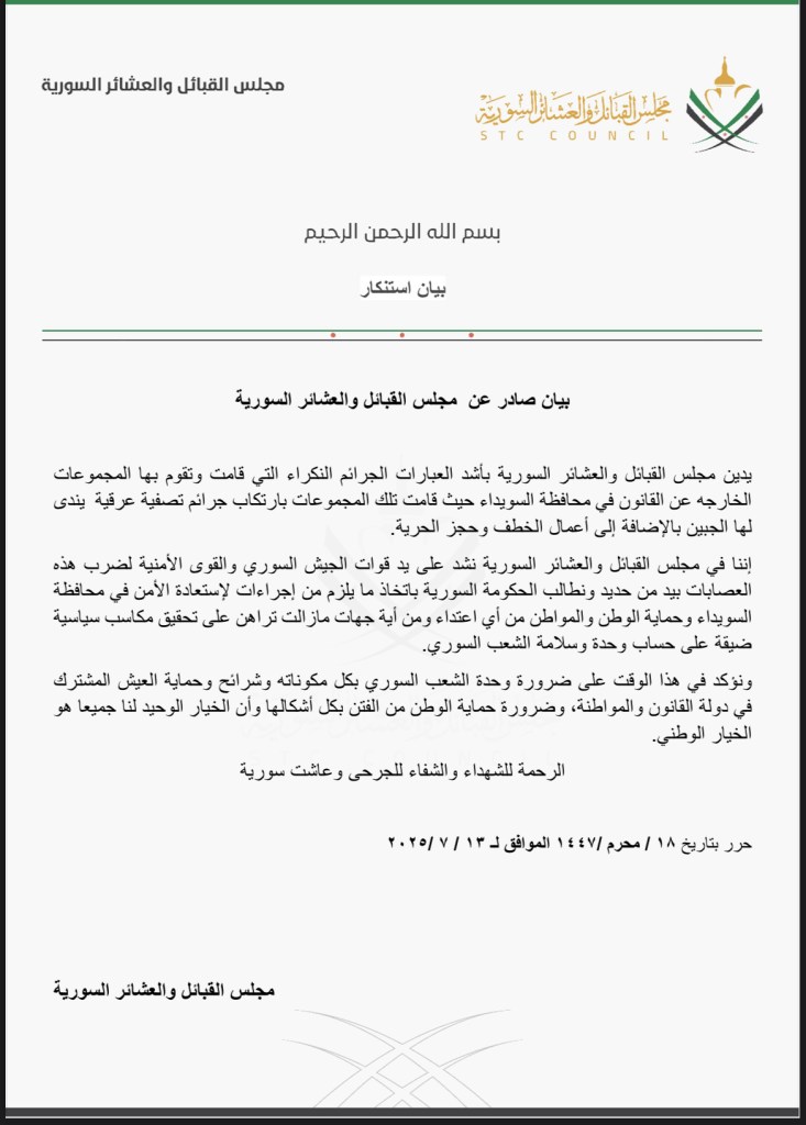 يدين مجلس القبائل والعشائر السورية بأشد العبارات الجرائم النكراء التي قامت وتقوم بها المجموعات الخارجه عن القانون في محافظة السويداء حيث قامت تلك المجموعات بارتكاب جرائم تصفية عرقية يندى لها الجبين بالإضافة إلى أعمال الخطف وحجز الحرية.