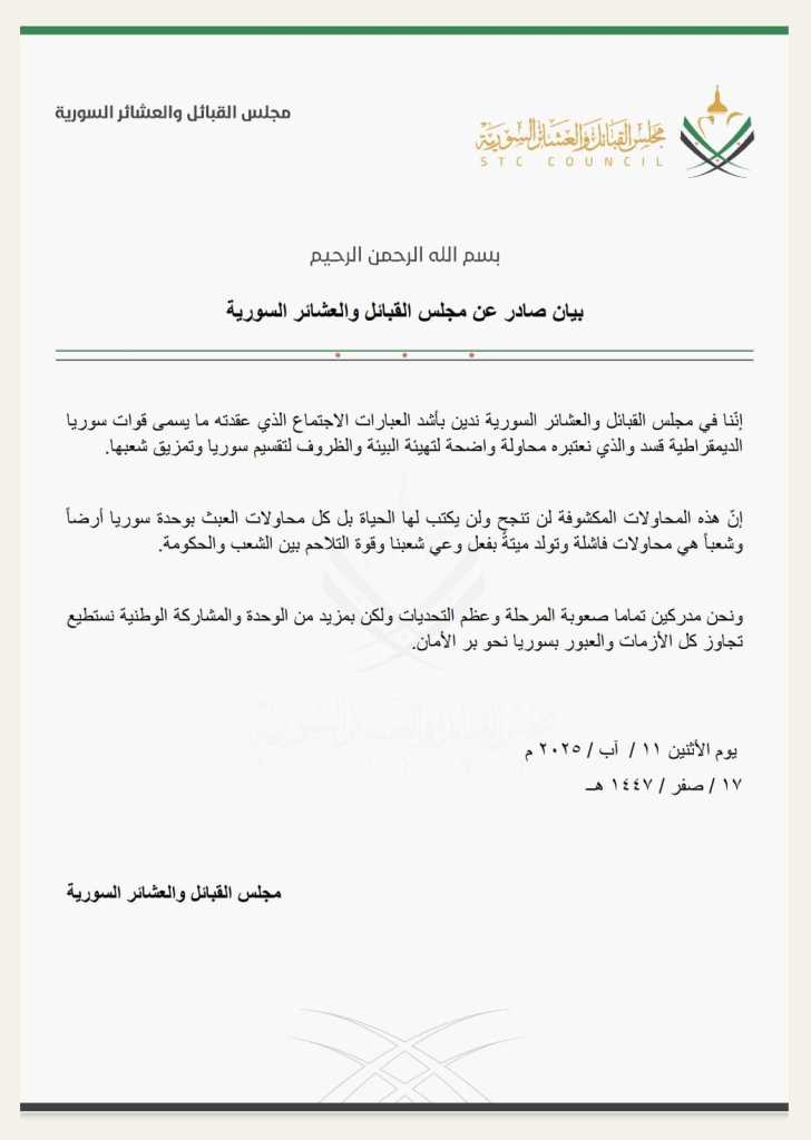 بيان صادر عن مجلس القبائل والعشائر السورية